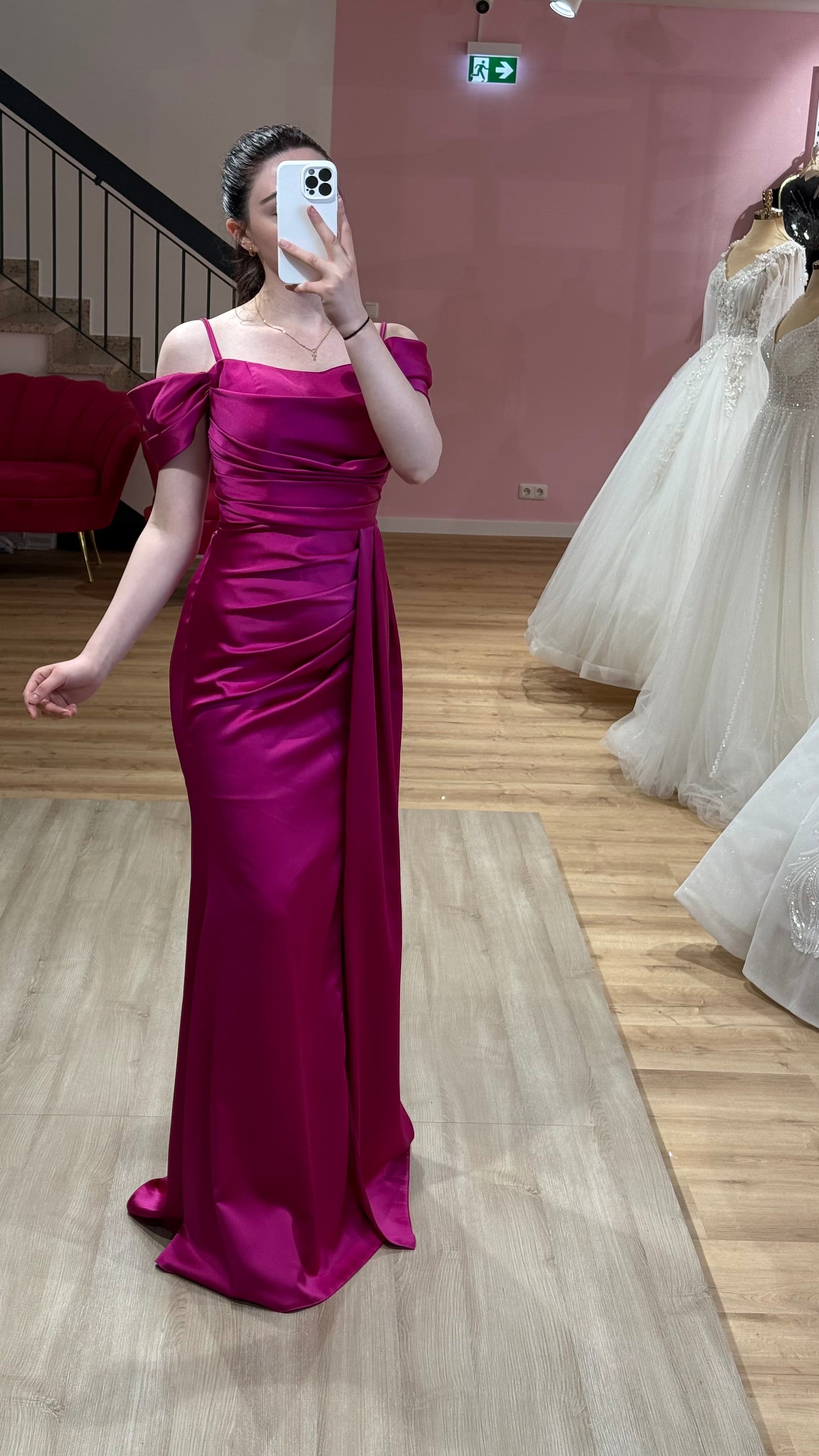 Langes Abendkleid aus edlem Satin in strahlendem Fuchsia. Mit hohem Schlitz, elegant fallendem Oberarm und freiem Halsausschnitt. Das Oberteil ist leicht drapiert mit zartem Rouge-Effekt, an der Seite ergänzt durch eine stilvolle Schleppe. Ein sehr eleganter Look – perfekt für Abiball, Verlobung, Hochzeitsgäste oder andere festliche Anlässe.