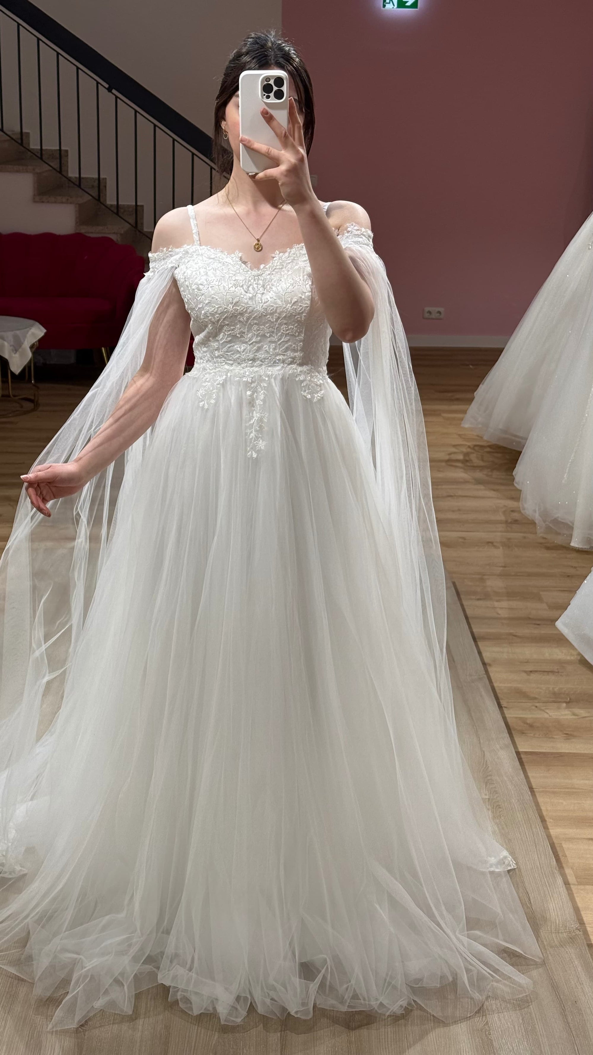 Dieses bezaubernde Brautkleid vereint Leichtigkeit und Eleganz. Mit seinem feinen Tüll wirkt es romantisch und märchenhaft, ohne überladen zu sein.
