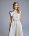 Dieses exquisite cremefarbene One-Shoulder-Abendkleid ist ein Highlight für jeden feierlichen Anlass. Das Oberteil besticht durch einen auffälligen, voluminösen Volant an der Schulter, akzentuiert mit feinen, glitzernden Paspeln. Die sanft schimmernde, hochwertige Qualität des Stoffes und der dezente Glitzergürtel in der Taille verleihen dem Kleid eine luxuriöse Ausstrahlung. Der Rock fällt in einer fließenden A-Linie zum Boden und sorgt für eine elegante, feminine Silhouette. Perfekt für Galas, Hochzeiten oder Bälle.