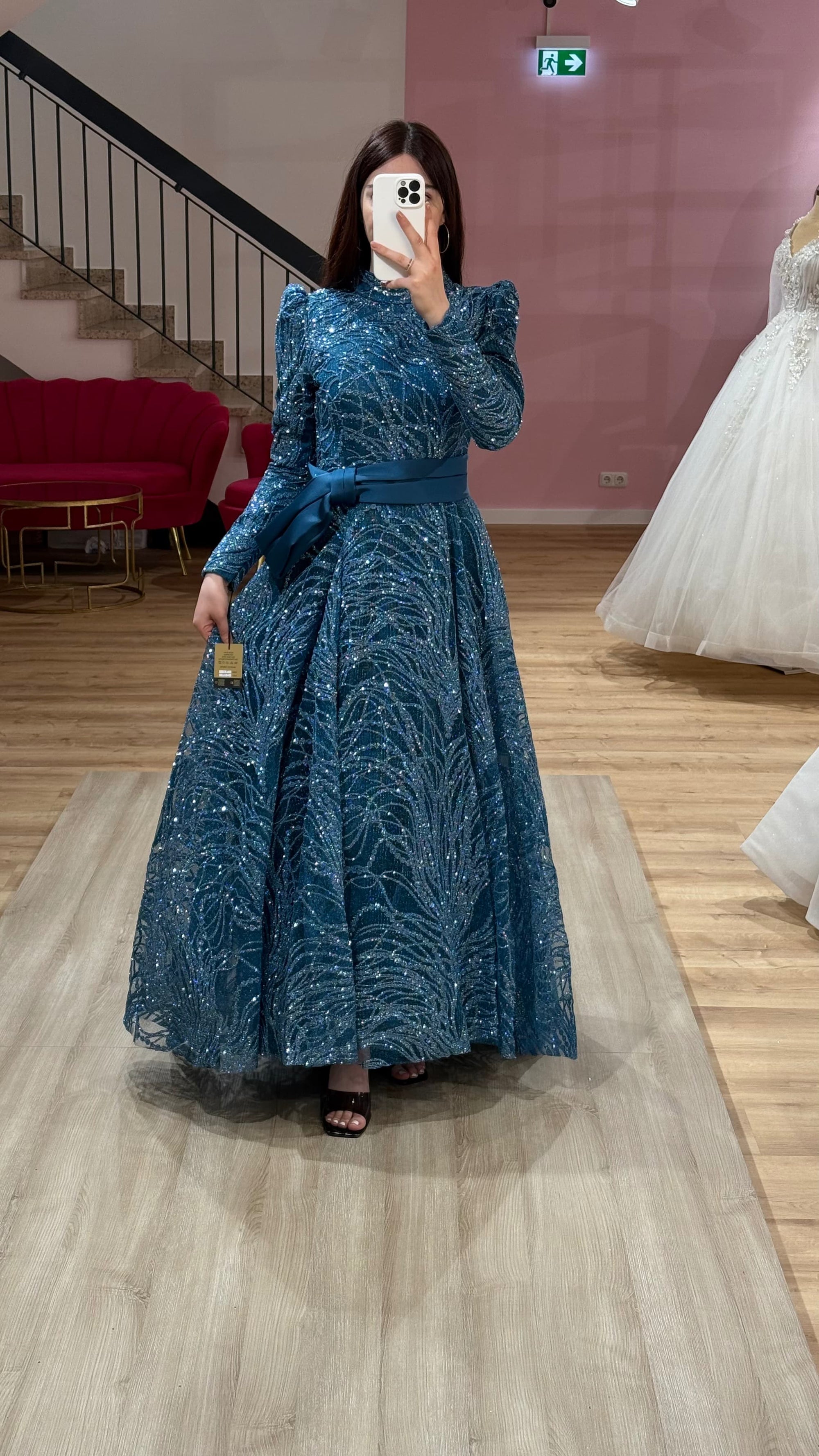 Elegantes Kleid mit langen Ärmeln und geschlossenem Hals. Vorne kürzer, hinten mit leichter Schleppe für einen edlen Look. Fällt schön und bequem, geeignet sowohl als Hijab-Kleid als auch für einen modernen Auftritt. Perfekt auch als Verlobungskleid.