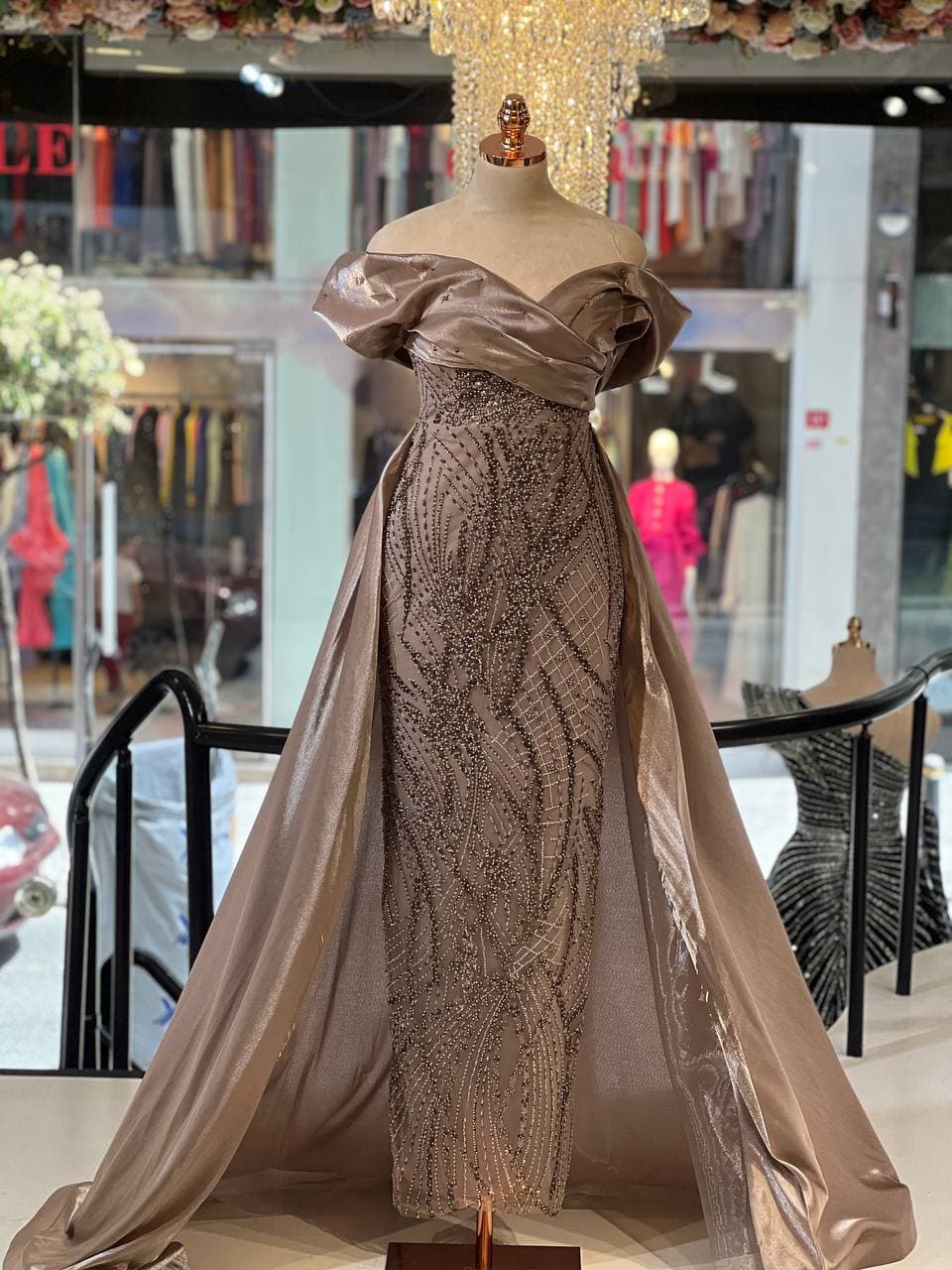 Dieses glamouröse Abendkleid in edlem Taupe ist ein echter Blickfang. Es besticht durch einen stilvollen Carmen-Ausschnitt und einen kunstvoll paillettenbesetzten Rock, der unter einem fließenden, schimmernden Überrock verborgen liegt. Ein perfektes Kleid für unvergessliche Abende.