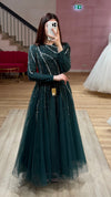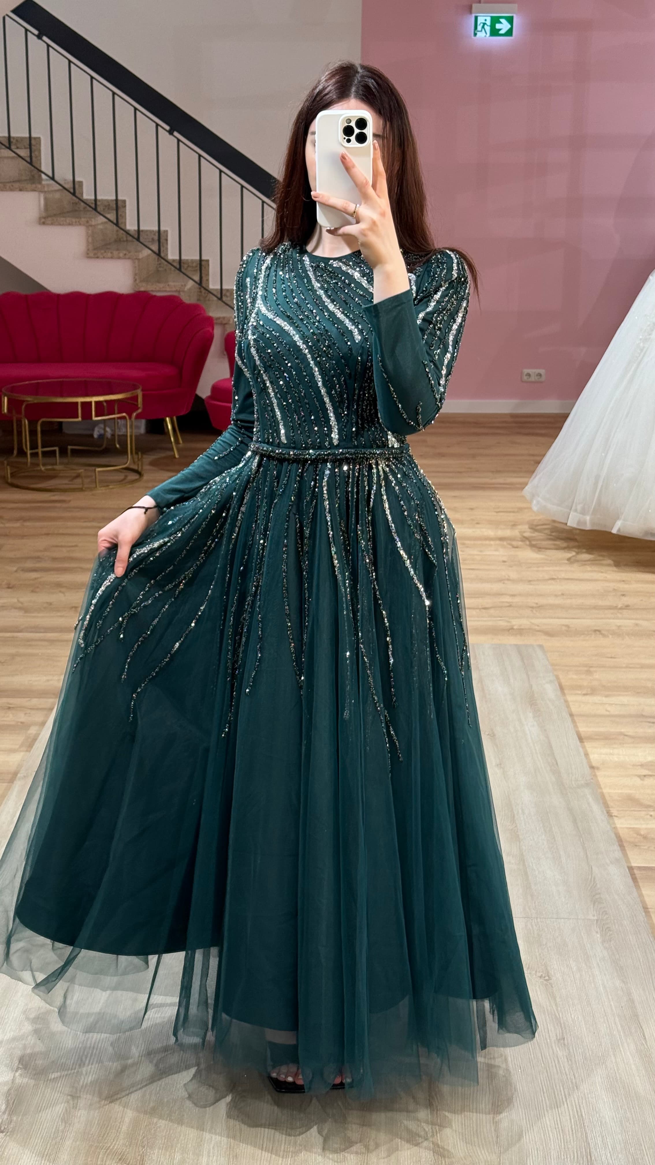 Elegantes Tüllkleid mit Rundhalsausschnitt. Das Oberteil ist mit funkelndem Glitzer verziert und in stilvollen dunkelgrünen und silbernen Streifen gestaltet. Leicht und edel fallend, perfekt für Anlässe wie Abiball, Verlobung oder als Hochzeitsgast. Auch für Hijabi wunderbar geeignet.