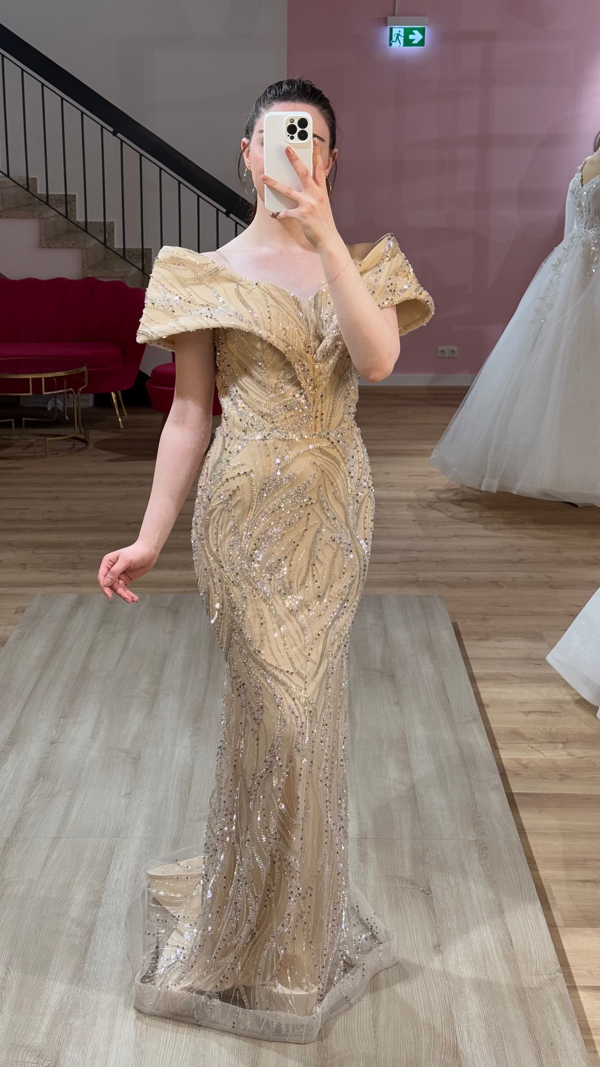 Ein luxuriöses und dramatisches Abendkleid in einem eleganten Nude/Champagner-Ton.