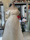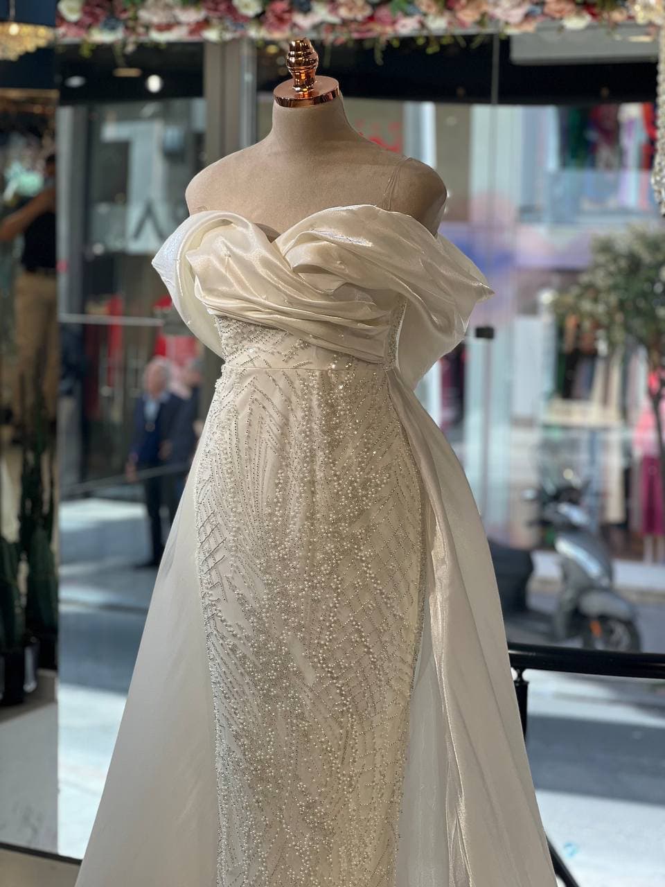Dieses traumhafte Kleid vereint moderne Eleganz mit einem Hauch von Glamour. Das figurbetonte Design mit feiner Perlenstickerei und funkelnden Details schmeichelt jeder Silhouette. Der zarte Off-Shoulder-Ausschnitt und der edle Überwurf aus Satin verleihen dem Kleid einen einzigartigen, romantischen Look. Perfekt für die standesamtliche Trauung oder einen unvergesslichen besonderen Anlass.
