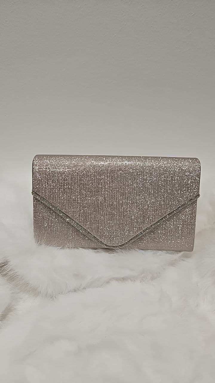 Diese stilvolle Umschlag-Clutch in edlem Roségold glänzt mit einem feinen, subtilen Glitzer-Finish. Die Klappe wird elegant durch eine funkelnde Strass-Linie akzentuiert.