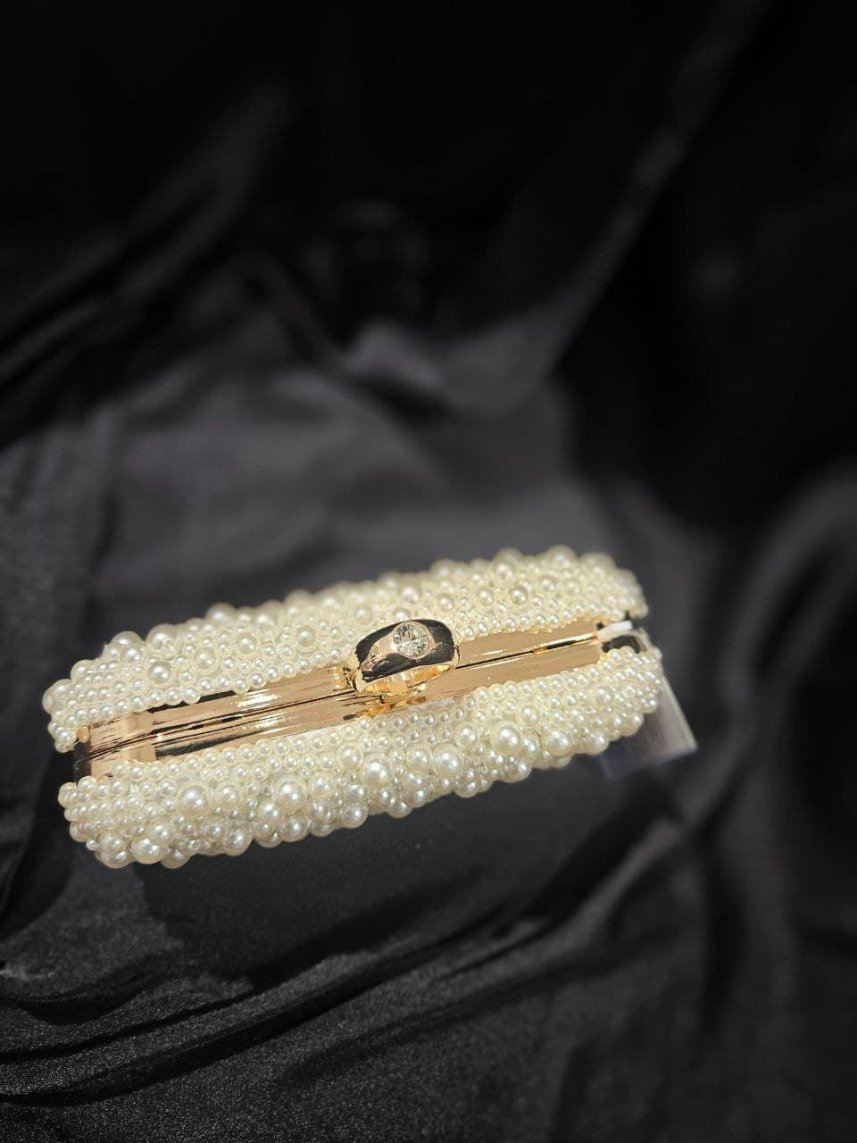 Diese elegante Box Clutch ist vollständig mit schimmernden, unterschiedlich großen Perlen besetzt und verfügt über einen luxuriösen Goldrahmen.