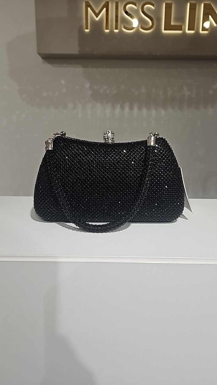 Diese atemberaubende Clutch ist vollständig mit funkelnden Strass-Steinen besetzt. Ihre abgerundete Form und der verzierte Strass-Verschluss machen sie zum perfekten Blickfang.