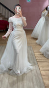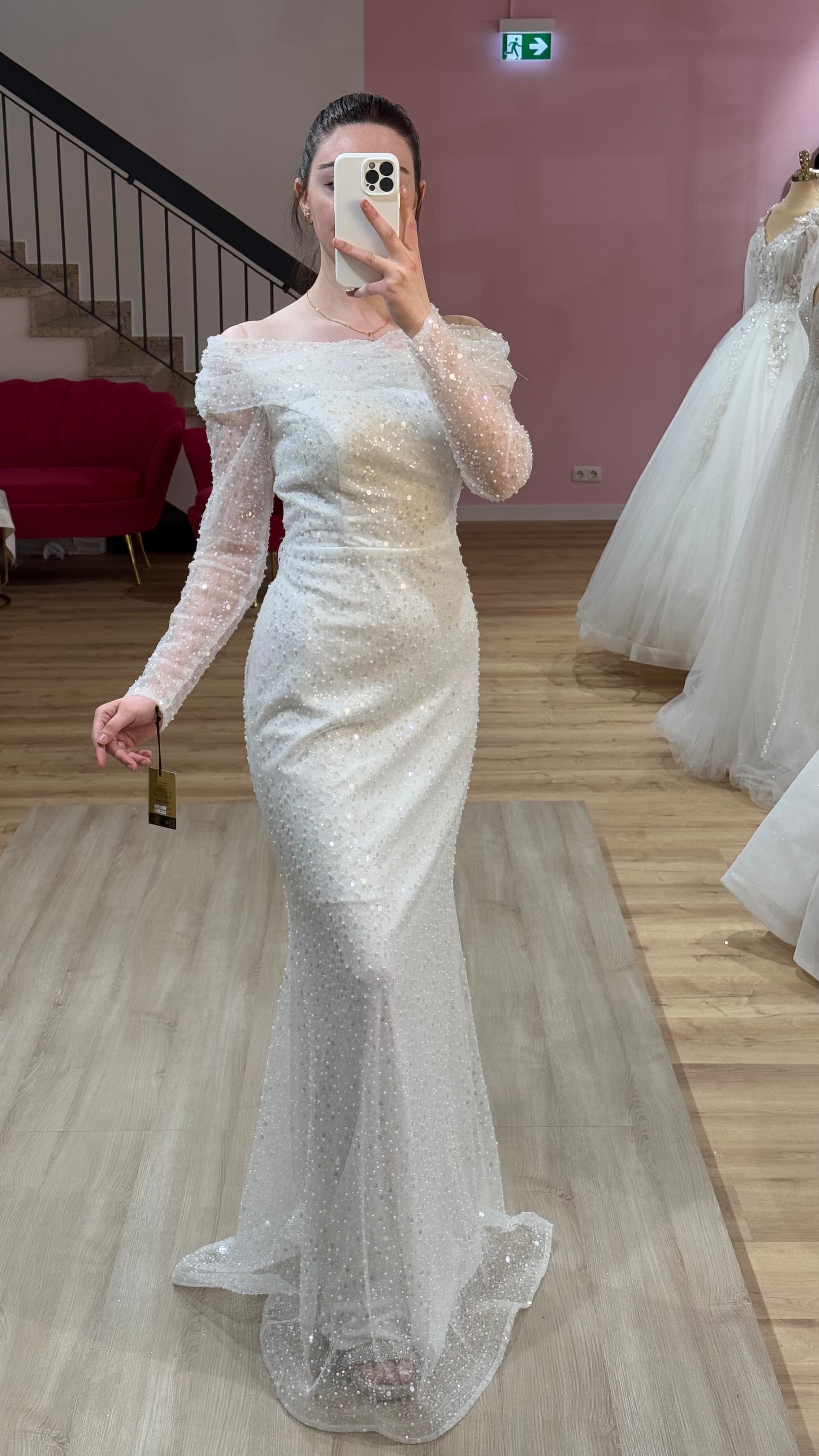 Elegantes Standesamtkleid im geraden Schnitt – leicht und edel. Feiner Stoff mit Perlen und Pailletten verziert, wunderschöner Halbkragen, lange Ärmel und abnehmbare Schleppe für einen flexiblen Look.